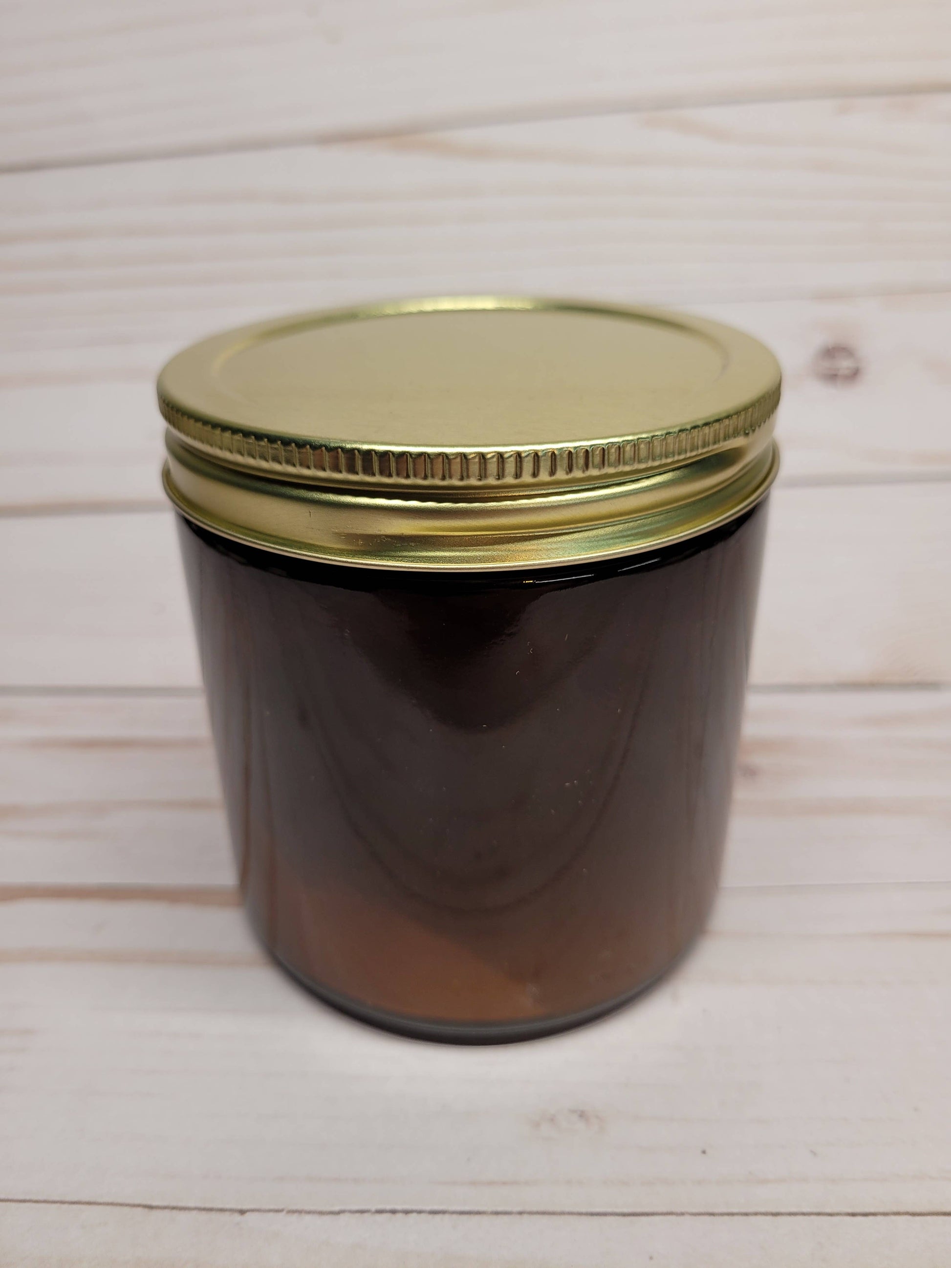 Our 9oz AMBER jar soy wax candle comes labeled or unlabeled with a wood wick and your choice of a black, white, gold, or silver lid. Custom labeling is available.