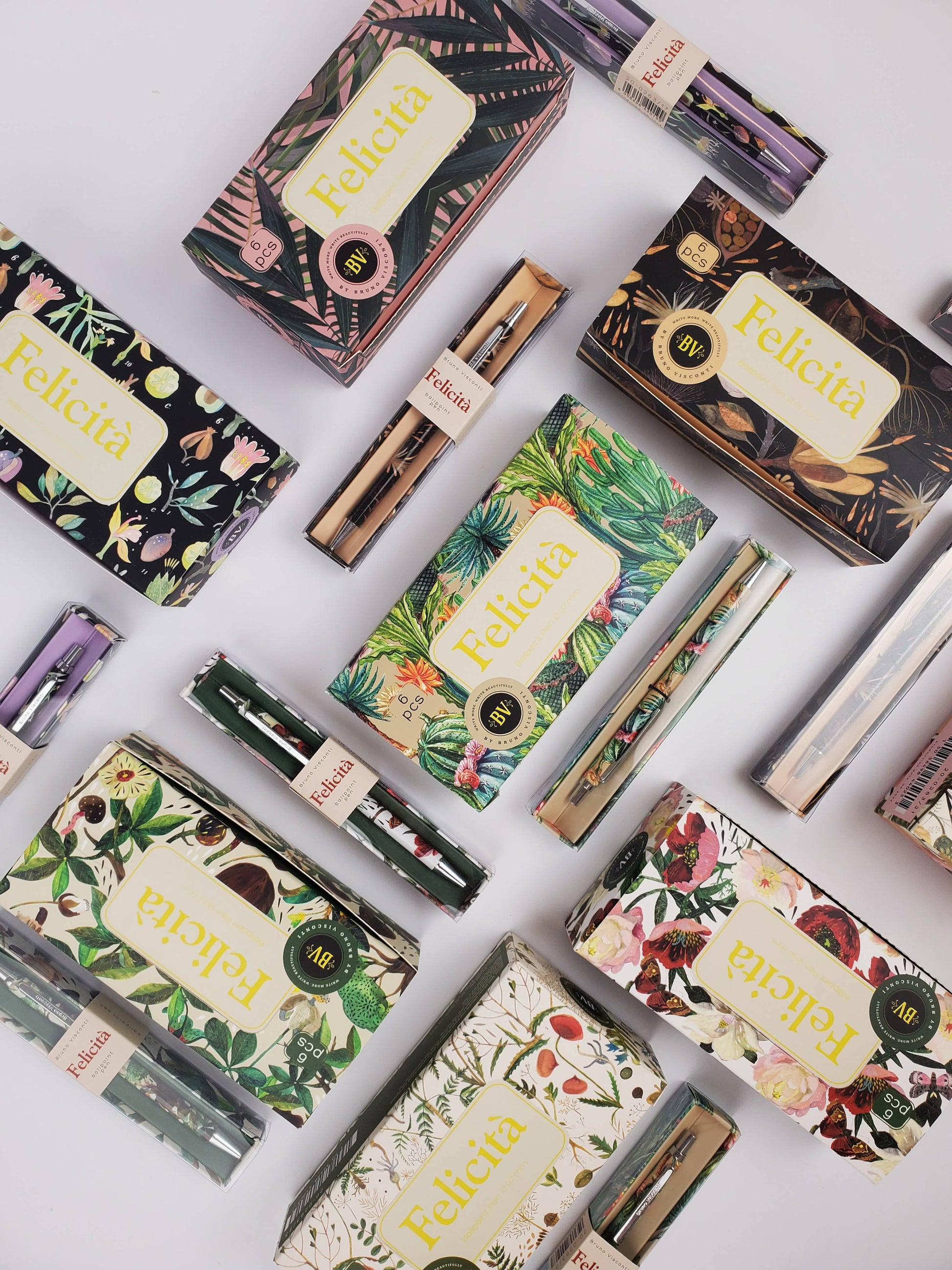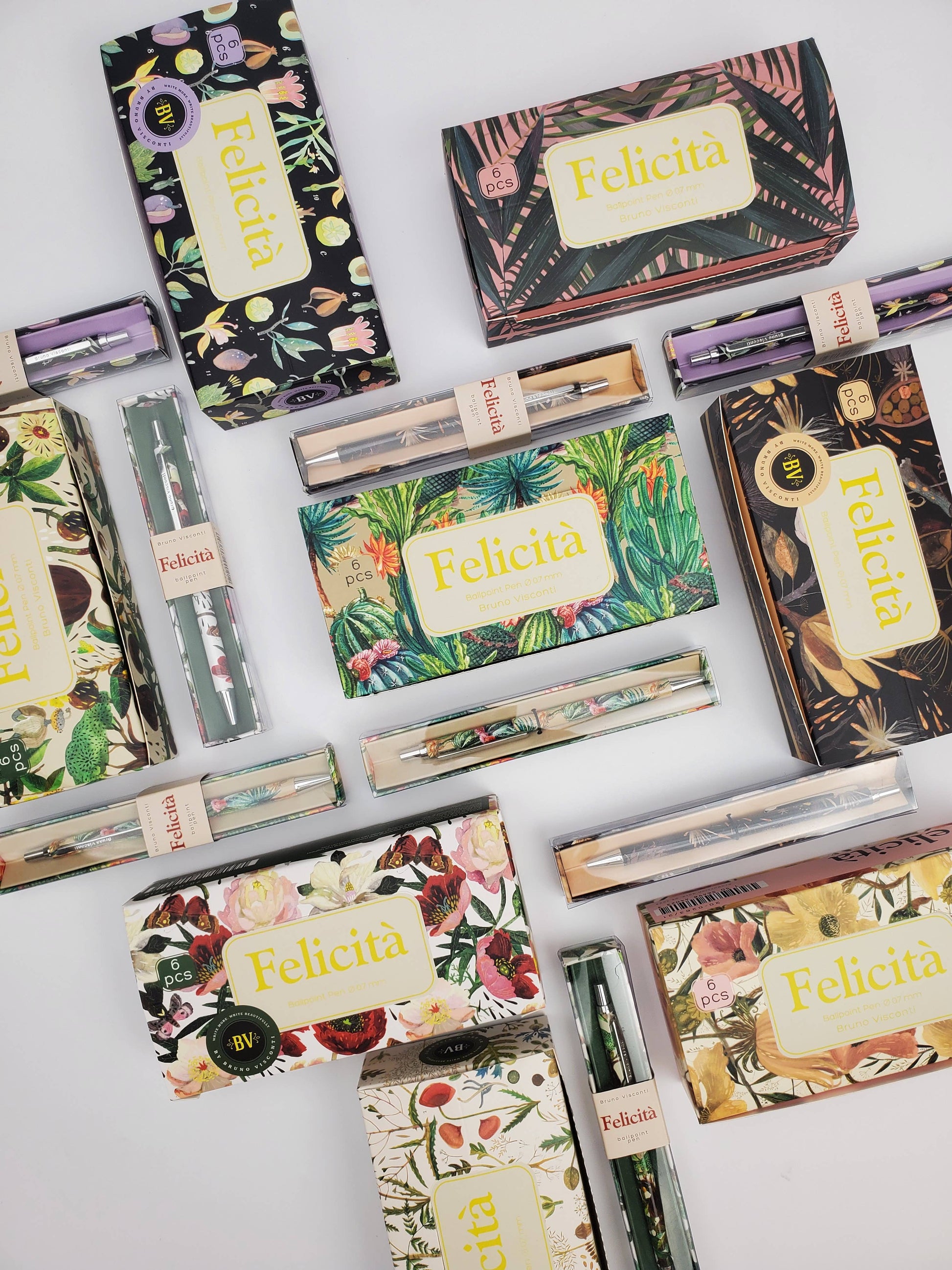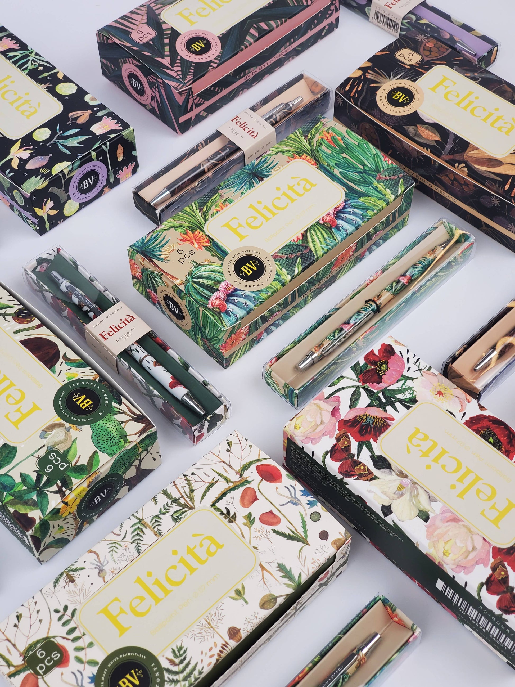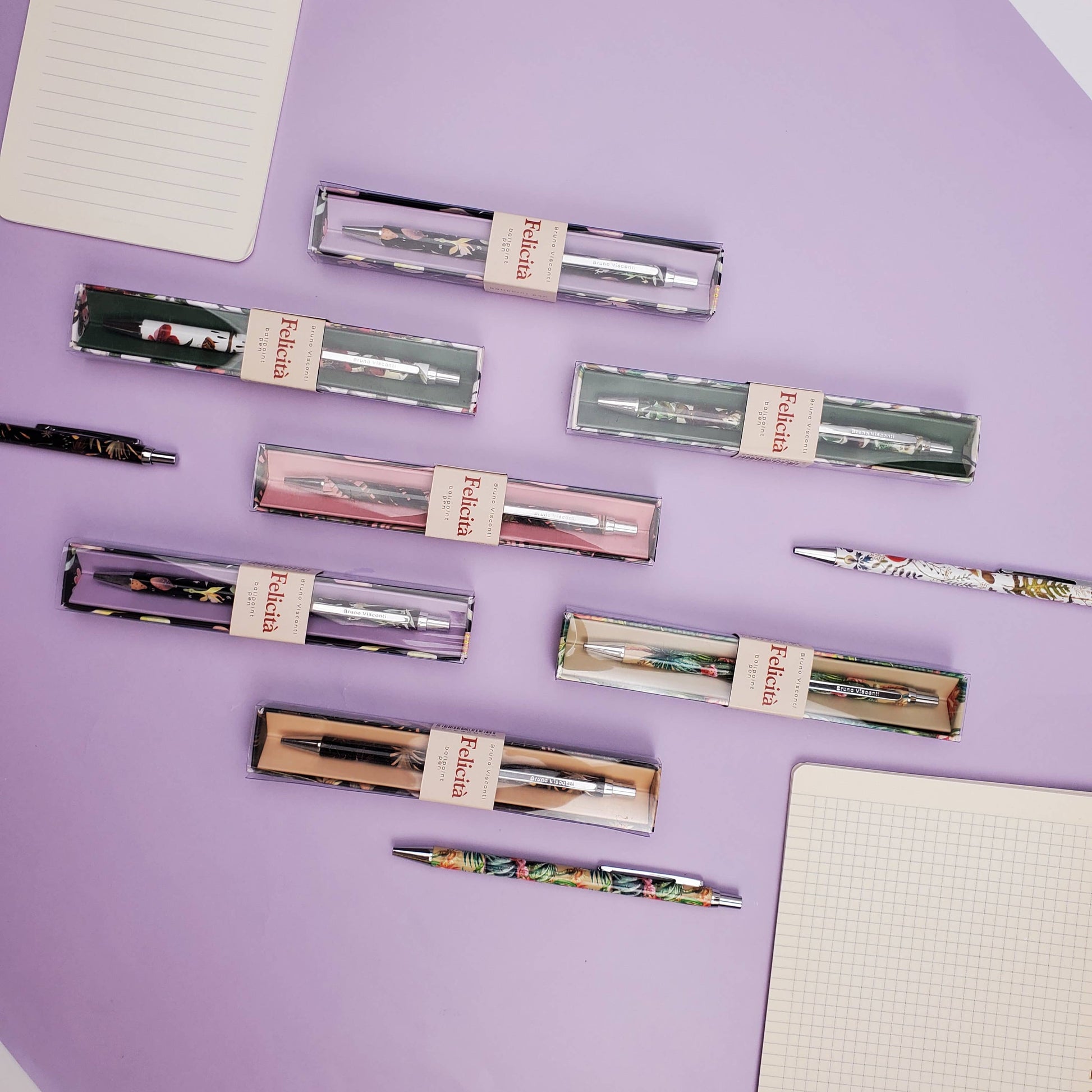 Our new Felicita Pens feature our beautiful illustrations of our most popular Flora Designs on a steel barrel with a .7mm ball point tip and black ink. Each Felicita Pen comes in a coordinating individual gift box and in a CDU of 6 pieces