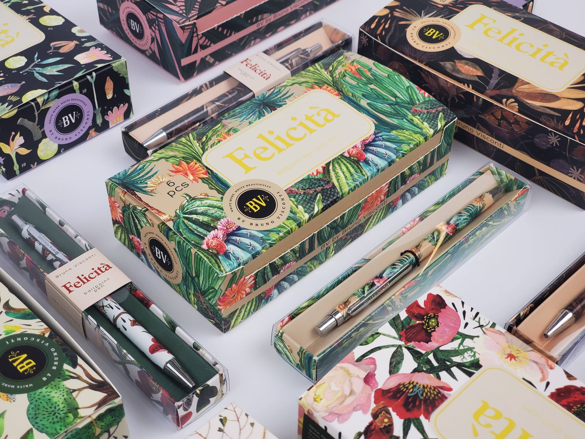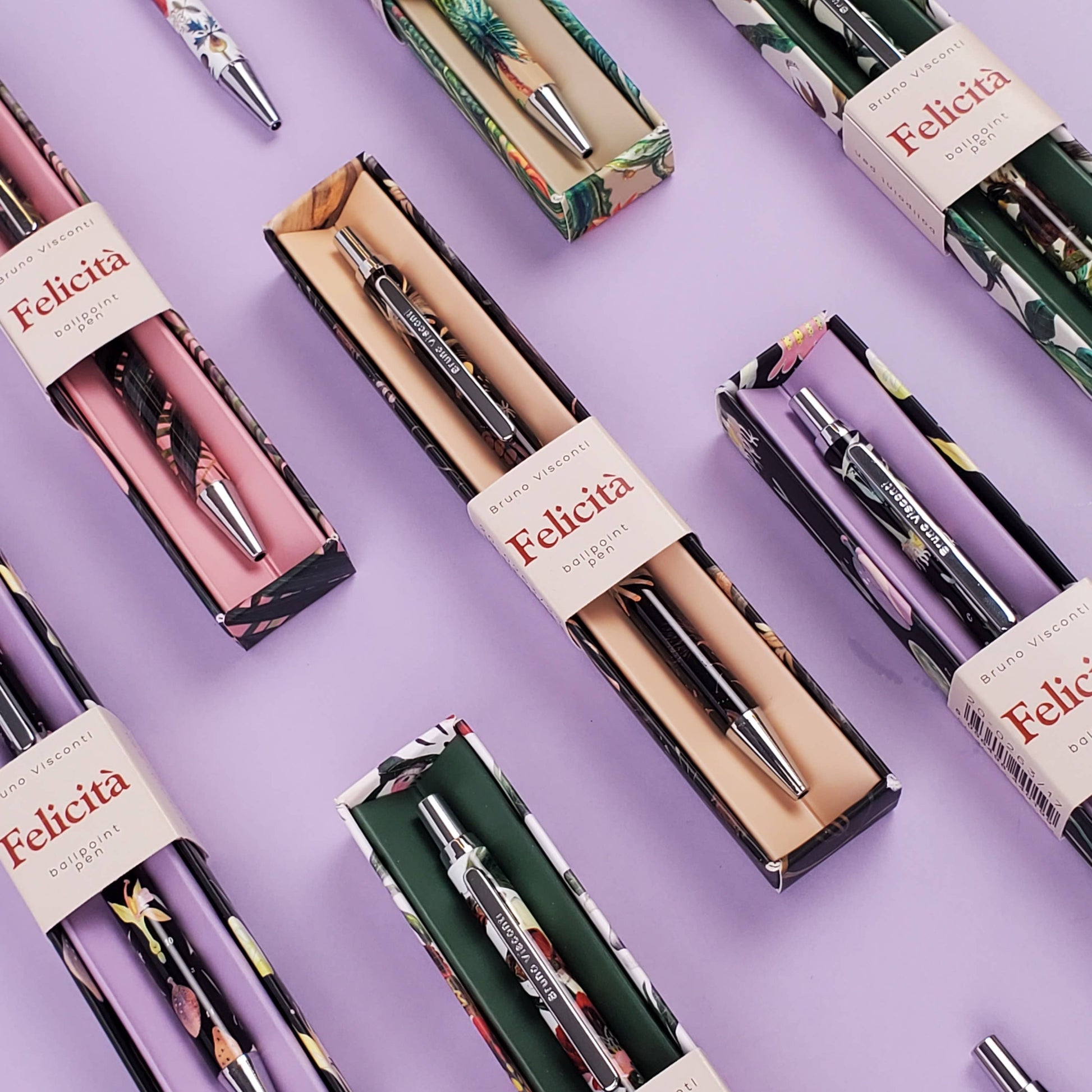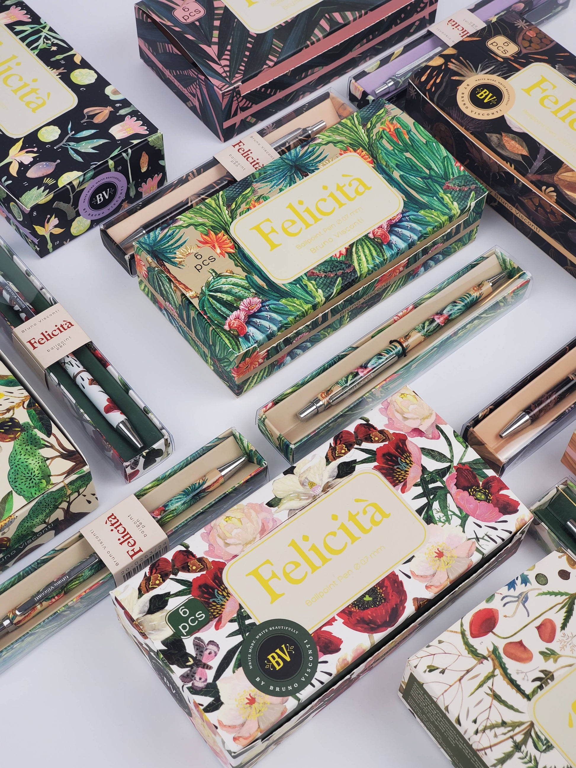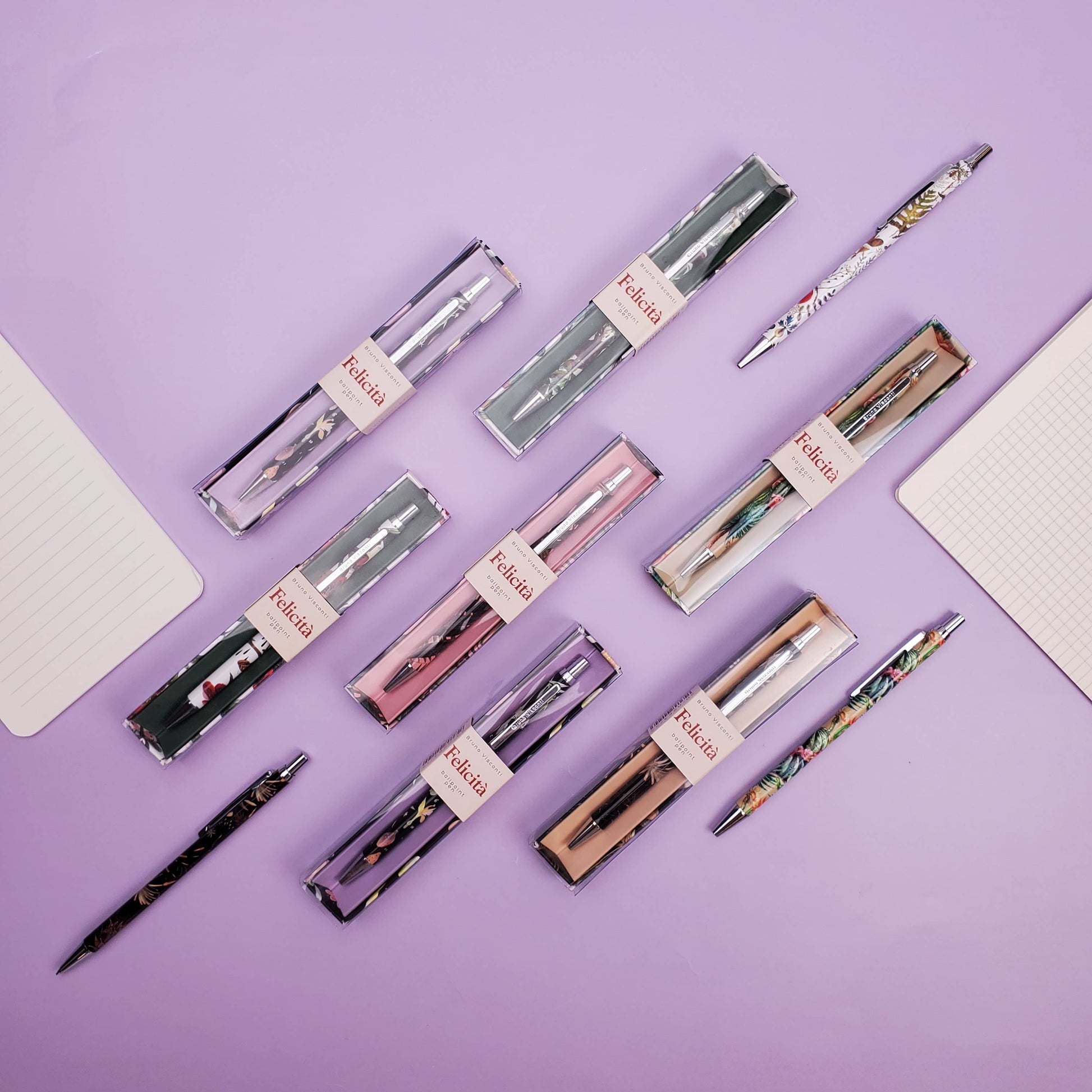 Our new Felicita Pens feature our beautiful illustrations of our most popular Flora Designs on a steel barrel with a .7mm ball point tip and black ink. Each Felicita Pen comes in a coordinating individual gift box and in a CDU of 6 pieces