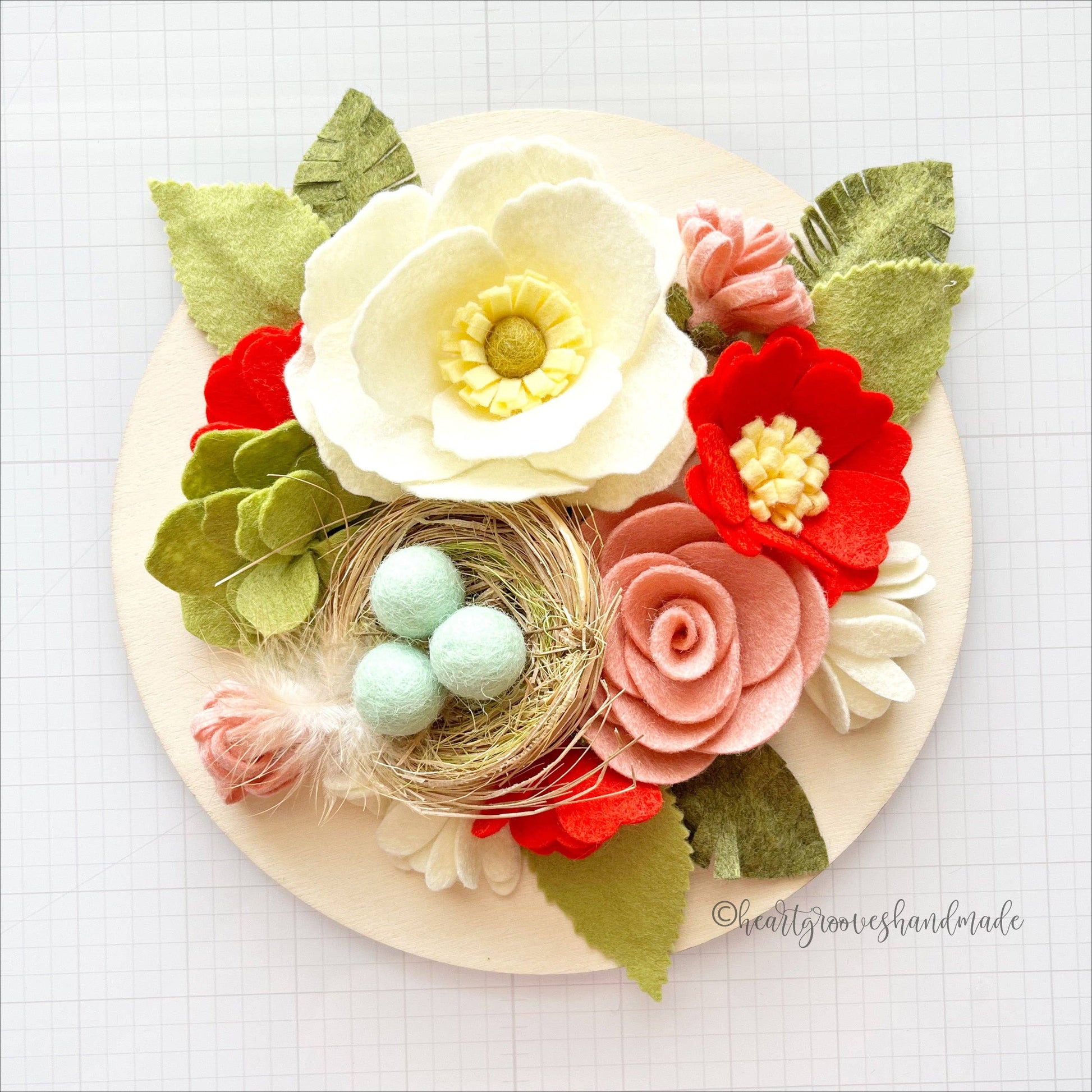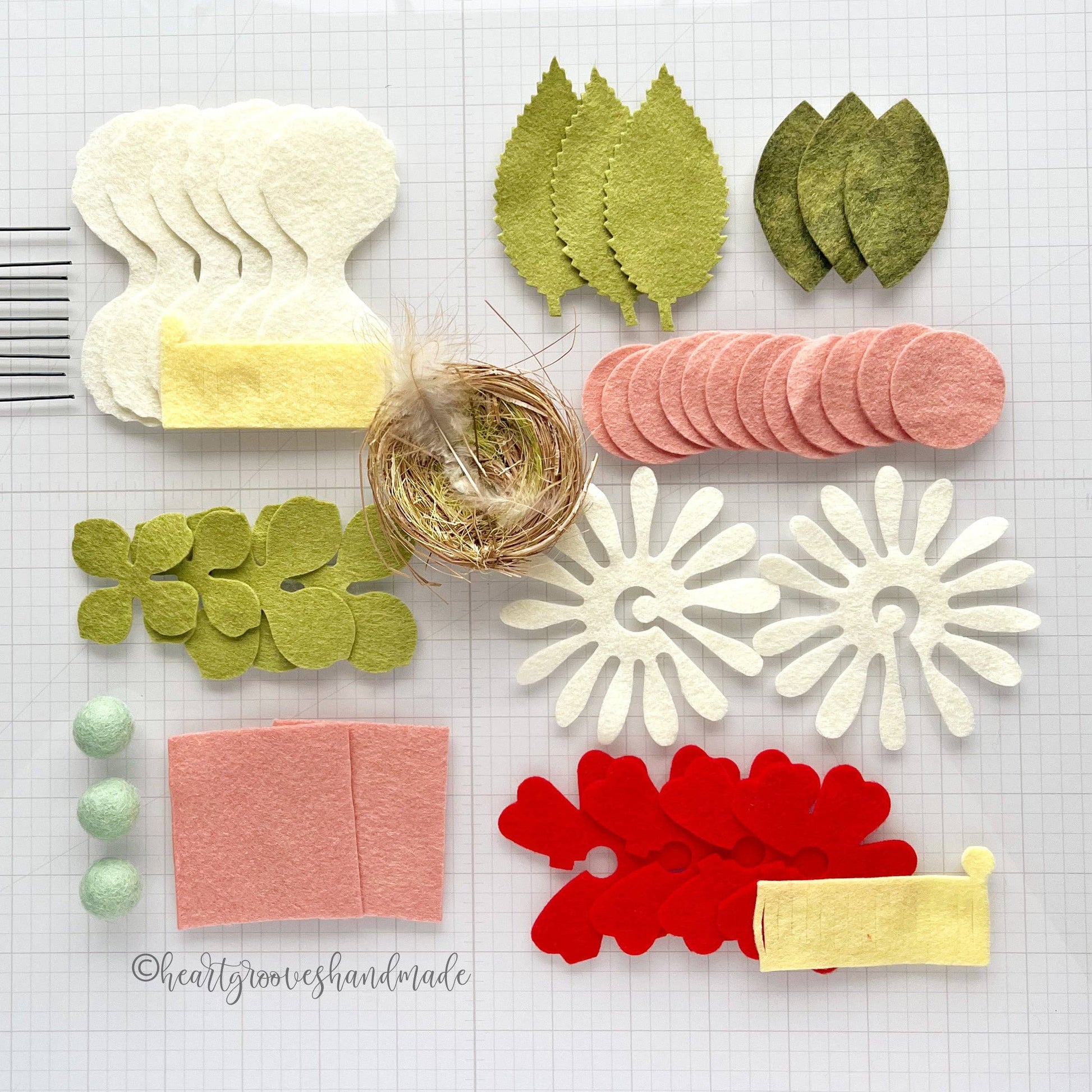 This Felt Flower Craft Kit is designed by Beth at Heartgrooves Handmade to encourage you in making beautiful felt flowers on your own. The high-quality wool blend felt pieces are cut and organized for you to have a fun and stress-free crafting experience. The kit includes a link to download written step-by-step instructions with photos. All you will need is a hot glue gun and sharp scissors for minimal cutting to complete the flowers. There are supplies to make 1 white poppy, 1 teacup rose, 1 hawarthia succulent, 1 cosmos, 6 various buds, and 6 leaves/ferns. And of course, the best part is the cute little bird's nest with 3 felt ball eggs :) When completed, the finished size of the main flowers range approximately 2-5" in diameter.