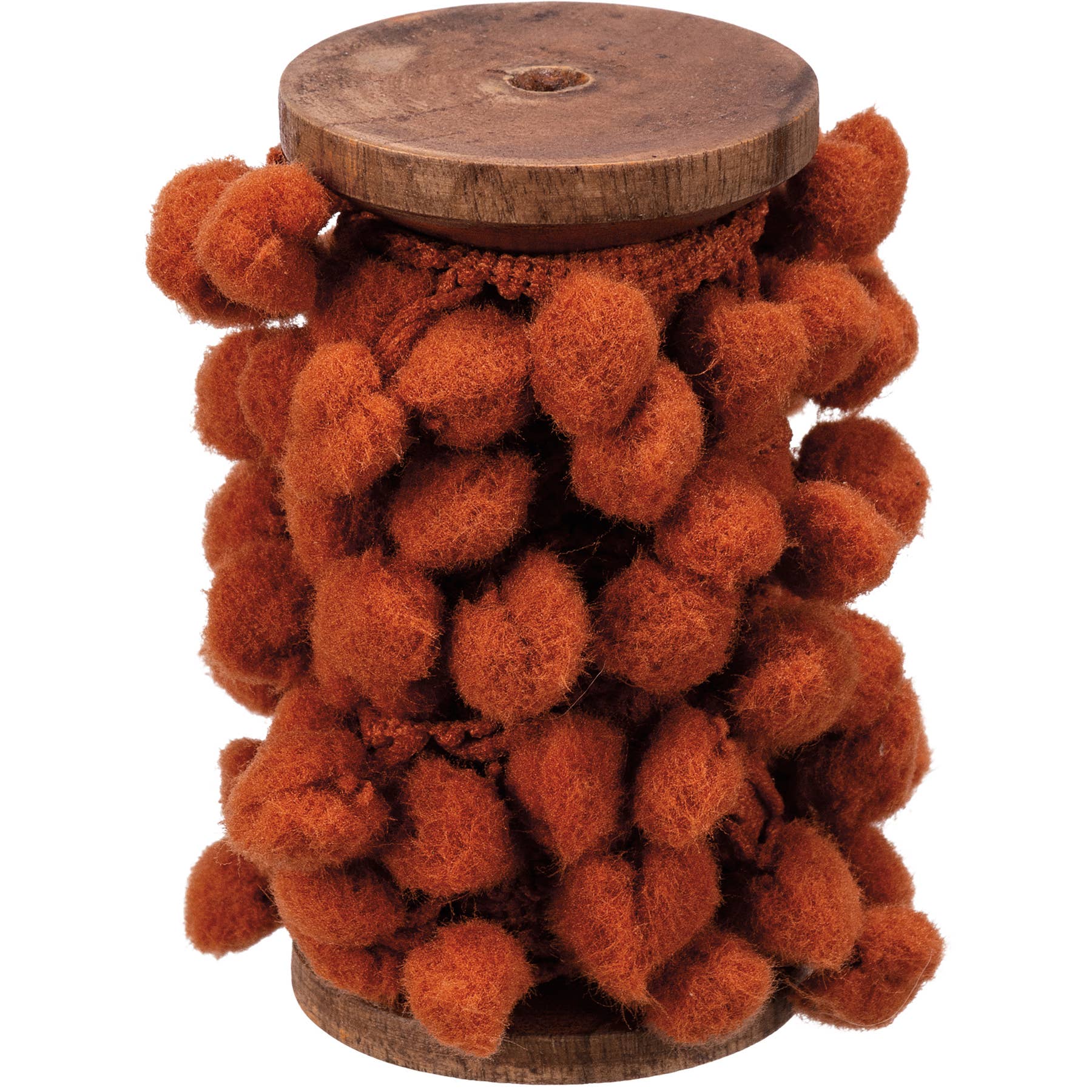 A bohemian style mini pom pom ribbon garland from our Bohemian Collection comes in burnt orange and packaged on a rustic wooden spool. Our Poms On Spool garland is a perfect decoration for the holidays.